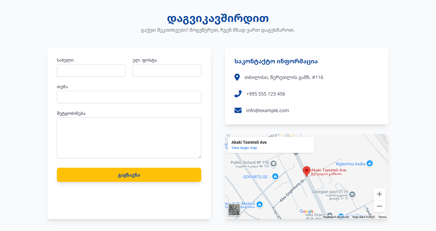 💬 მარტივი კომუნიკაცია: ინტეგრირებული საკონტაქტო და ონლაინ კონსულტაციის ფორმები ამარტივებს კავშირს. მიიღეთ მოთხოვნები პირდაპირ ადმინისტრაციულ პანელში და არ დაკარგოთ არც ერთი პოტენციური შეკვეთა.
